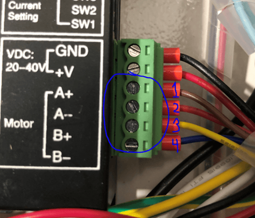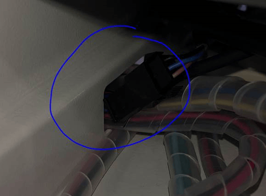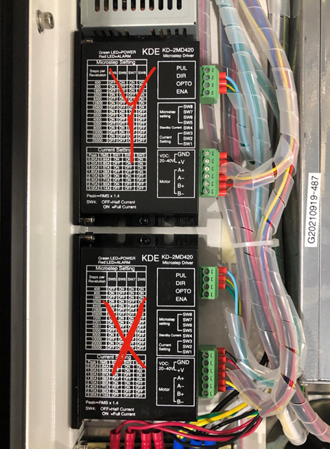 Before swapping the wires, be sure to turn the machine off, for safety purposes. To remove the old wire harness, you will need to remove the connection at the Y driver. Open the front control panel door to see the two black boxes. You will need to look at the Y black box, which is the box furthest from the front, as shown in the picture below.