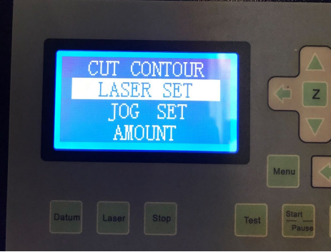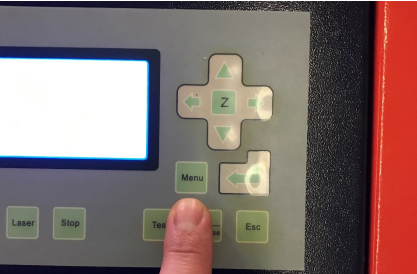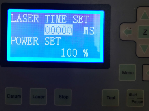 At the front of your control panel, set the laser power to 100 by Pressing the MENU > Laser Set > Enter > Laser Time Set should be set to 00000 and power to 100 > Enter.