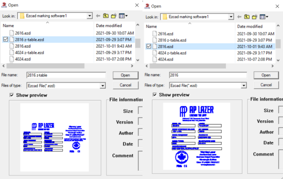 - With EzCad2 open, open the appropriate file corresponding to the tag number. The letter in front will determine which machine it is for. The letters are as follows.