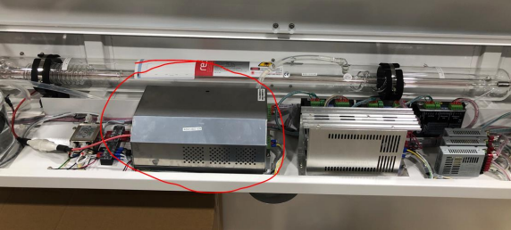 Just to be 100% certain if the issue pertains to the laser tube or the laser power supply, I just want to see if the laser lights up when pulsed manually. In the photo below, we will be looking at the laser power supply, circled in red.