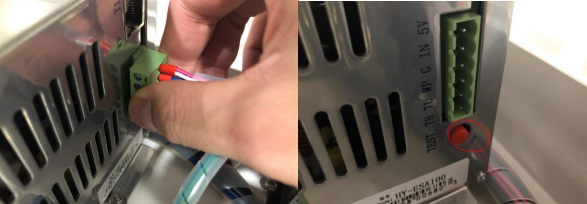 We will need to disconnect the green connector shown in the picture below, which should be on the right side of the laser power supply. After disconnecting the green connector, you can press the red button when the machine is on as shown below, and see if the laser tube lights up. You can also put masking tape at the end of the laser tube to see if it marks.