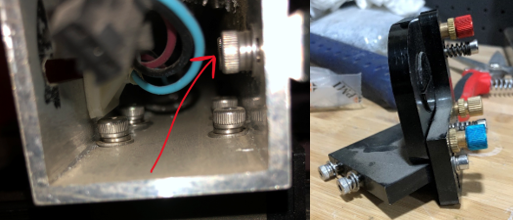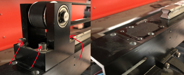 On the right side, the motor mount will need to be removed to access the screw holes as well. The picture below details the screws that need to be removed. Make sure the belt is loose to remove the motor mount.
