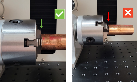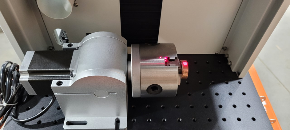 - Adjust the angle of the chuck rotary so that the part is perpendicular to the lens of the fiber laser.