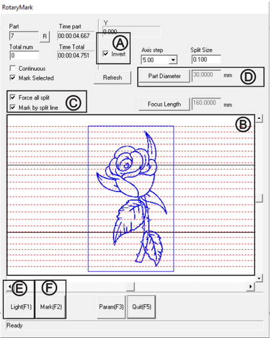 Note: To remove a split line, right click it in the RotaryMark preview. - Ensure that “Mark by split line” and “Force all split” is selected.