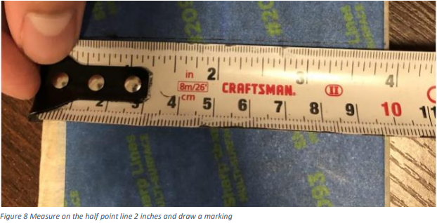 - Measure vertically on the middle point 2 inches and draw a line/marking at that point. this is the half point of the bench.