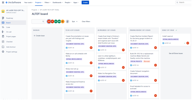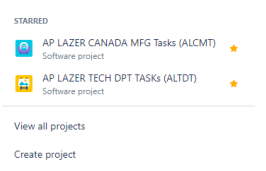 Jira is an organizational software utilized to organize tasks within the AP Lazer tech department. It helps you track your own tasks, as well as tasks set by others. For purposes of a support engineer, you will only need to be involved in two project pages; AP LAZER CANADA MFG TASKs and AP LAZER TECH DPT TASKs.