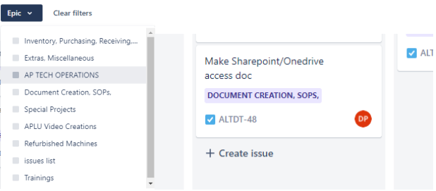 To create a new task, first select an issue type to put the issue under. Select the epic drop down menu and select the appropriate type. Then, go under the category you wish to create the issue under. Click create issue and add the description of the issue. Once complete, press enter to create an issue.