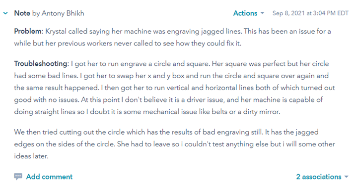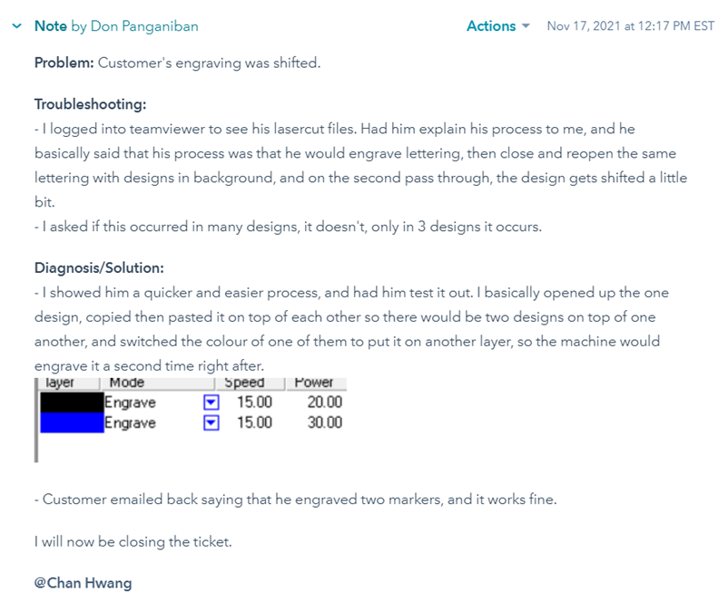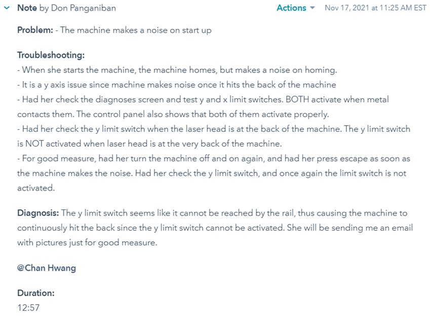 When making a ticket for a customer, you should be concise in your ticket, writing only relevant detailed information pertaining to the problem at hand. You should first write down what the problem is. You should then write a troubleshooting section, detailing what you have tried to do to solve the issue. Once all your troubleshooting is written down, you should next write down your diagnosis, and what you think the problem is. If you have the solution to the problem, write that down as well. If the problem lies with a missing part, always tag Chan Hwang, as he oversees the manufacturing side of the machines, thus he will check if it is the manufacturing department’s fault. Below are good examples of how a ticket should be written. You should also add the duration of not only the call, but also the duration of things you have done to solve the ticket.
